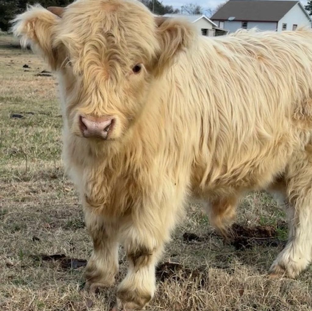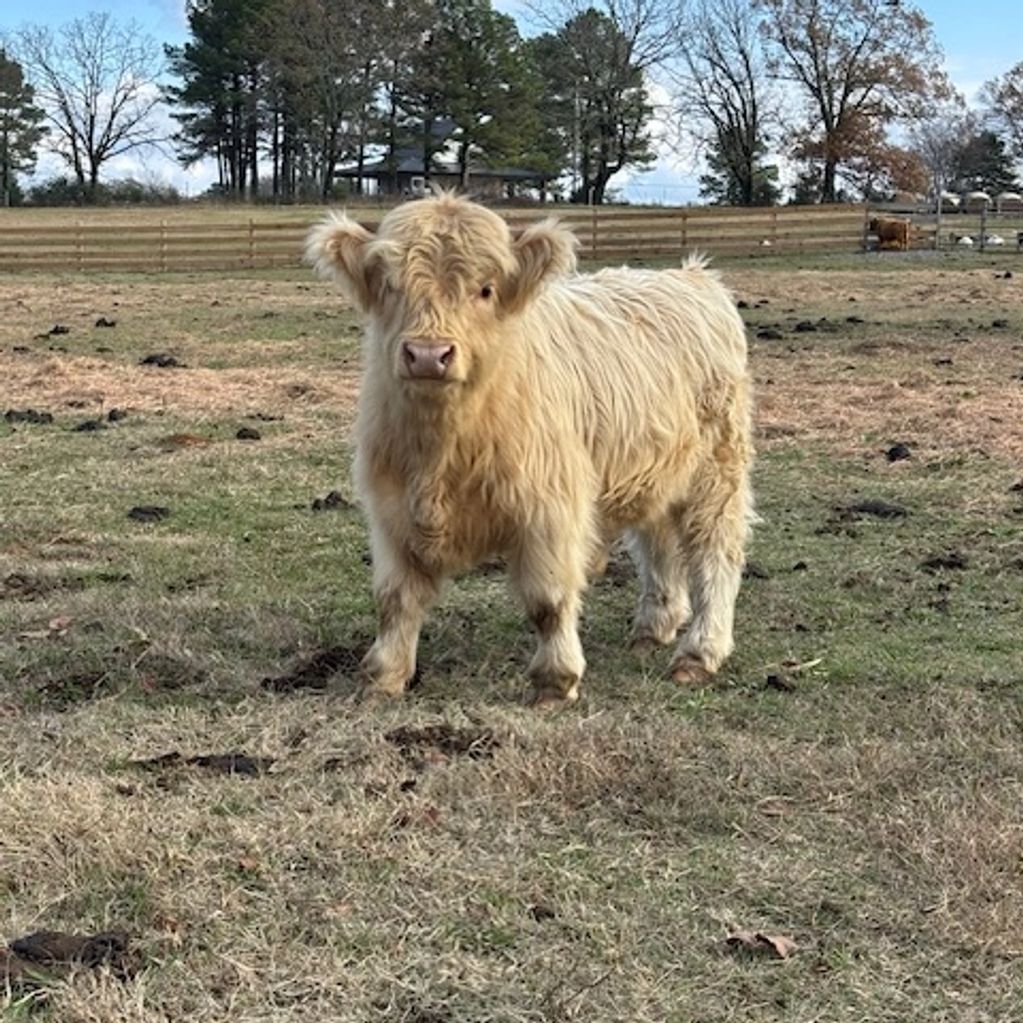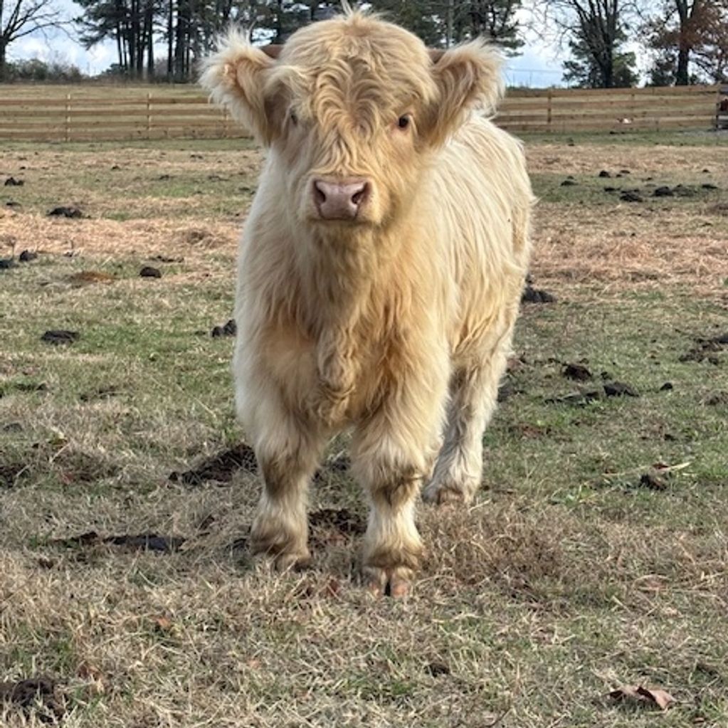 Arlo is a 75% Highland bull calf out of farm favorite Sparkles. Arlo has all the fluff you could ask for. He is the very desirable color white, and he is so stinkin small! Suspected chondro positive, he has great micro potential looking at parent's heights and his current size. He is built very correct. $8,000
